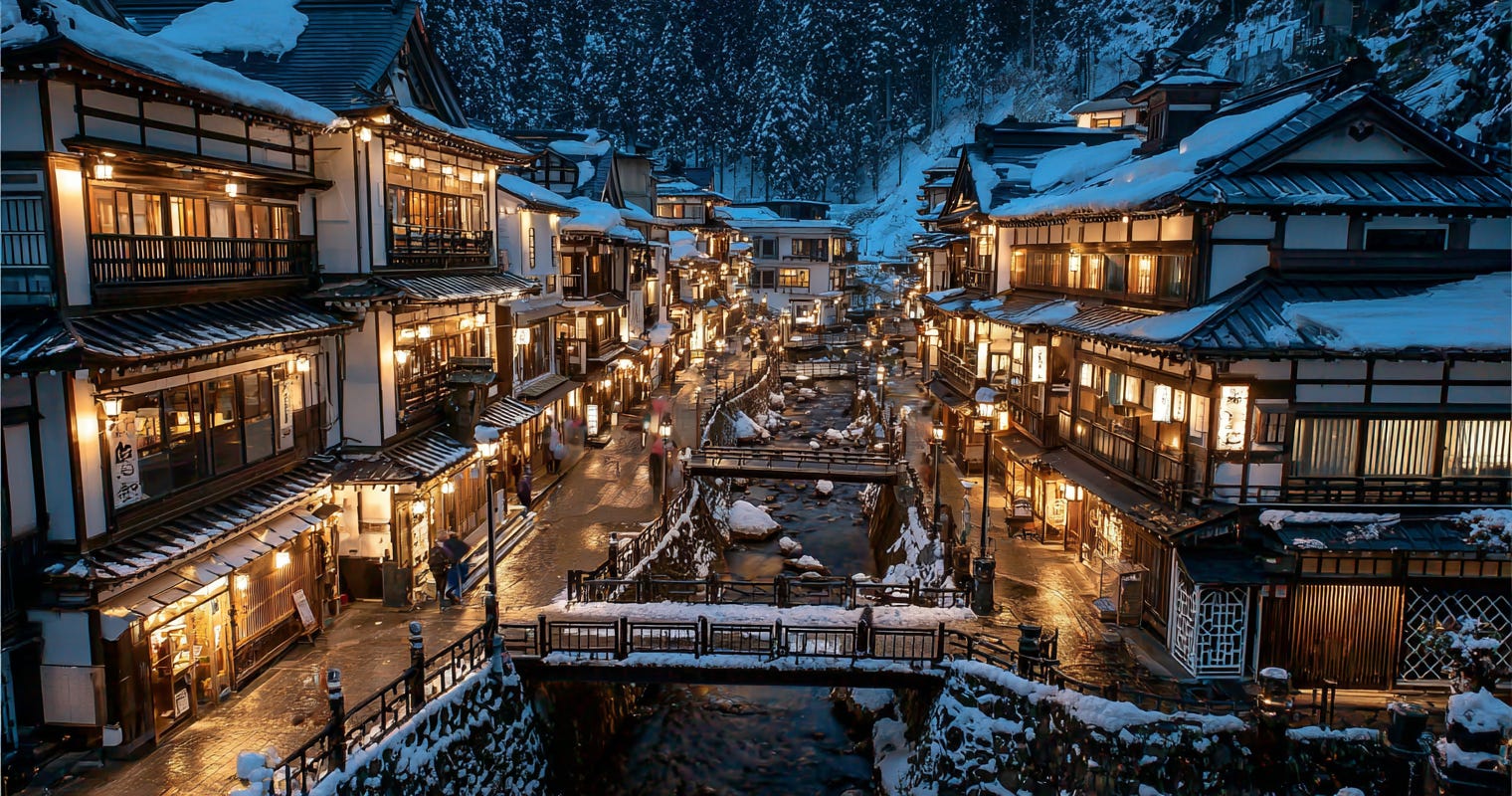 Ginzan Onsen, if you choose it, feels almost unreal in winter. Snow-covered wooden buildings, narrow streets, glowing windows — it’s beautiful, but also cold and quiet. You don’t rush here. You don’t multitask. You exist.