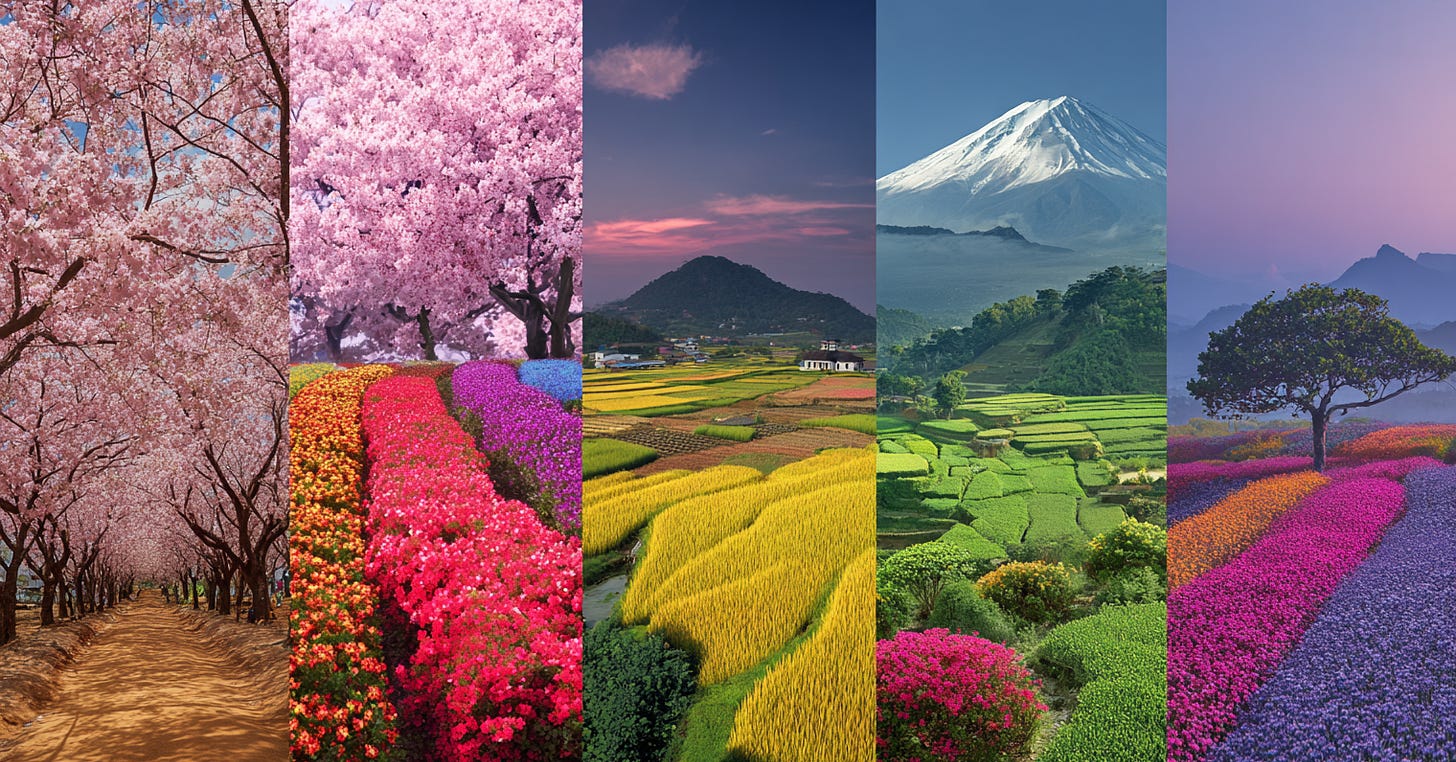 Nature at its photogenic peak (late sakura, canola blooms, Laomei algae, Sapa terraces)